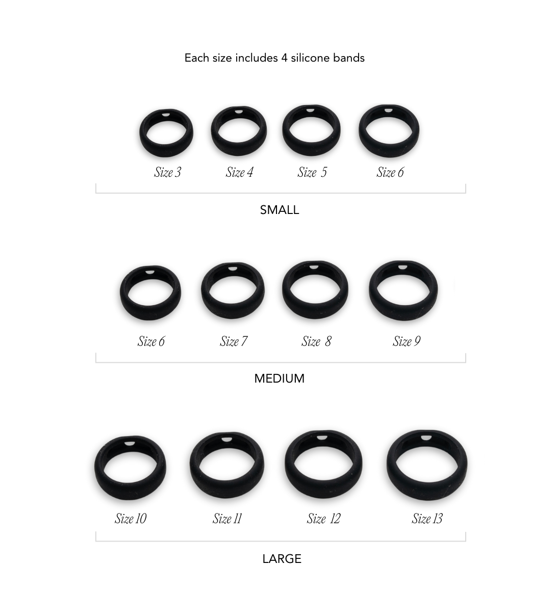 Expression of the self spans all sizes. Make Tease your own with eleven ring band sizes to choose from. Ring kits in small, medium, and large—each with four band sizes—allow you to explore different bands to find your perfect fit.